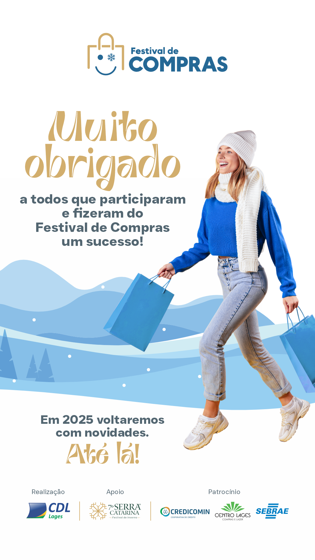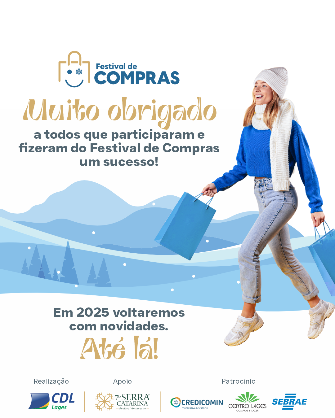Cada compra realizada se transformou em uma chance de ganhar uma mochila/necessaire, disponíveis nas cores coral, marinho e turquesa! “Graças à sua participação, o festival foi um sucesso e fortaleceu a relação entre comerciantes e consumidores. Agradecemos a todos que nos acompanharam nesta jornada, e um agradecimento especial à CDL Lages, ao 7º Serra Catarina Festival de Inverno, e aos nossos patrocinadores, Credicomin e Sebrae, que tornaram tudo isso possível, ressaltou a Coordenadora do Núcleo Centro Lages, Agnes Prachthauser.