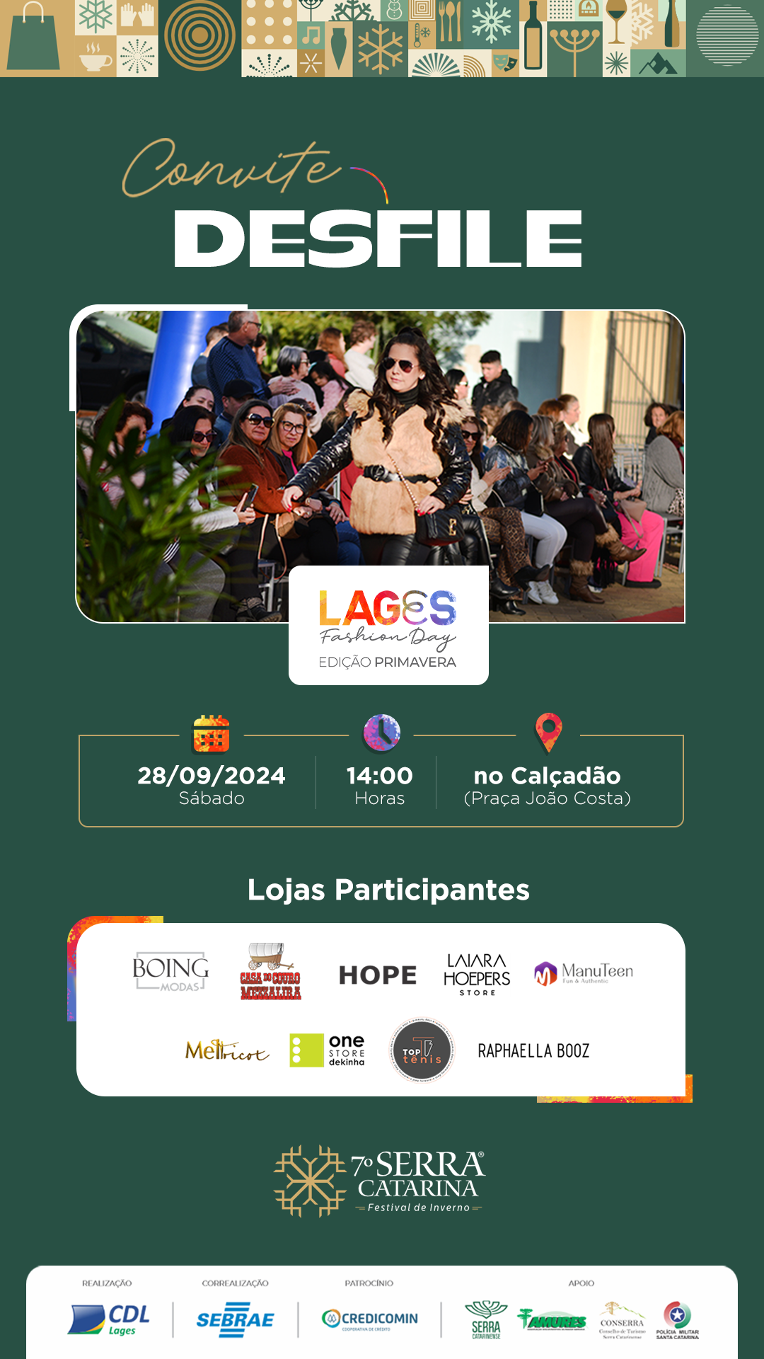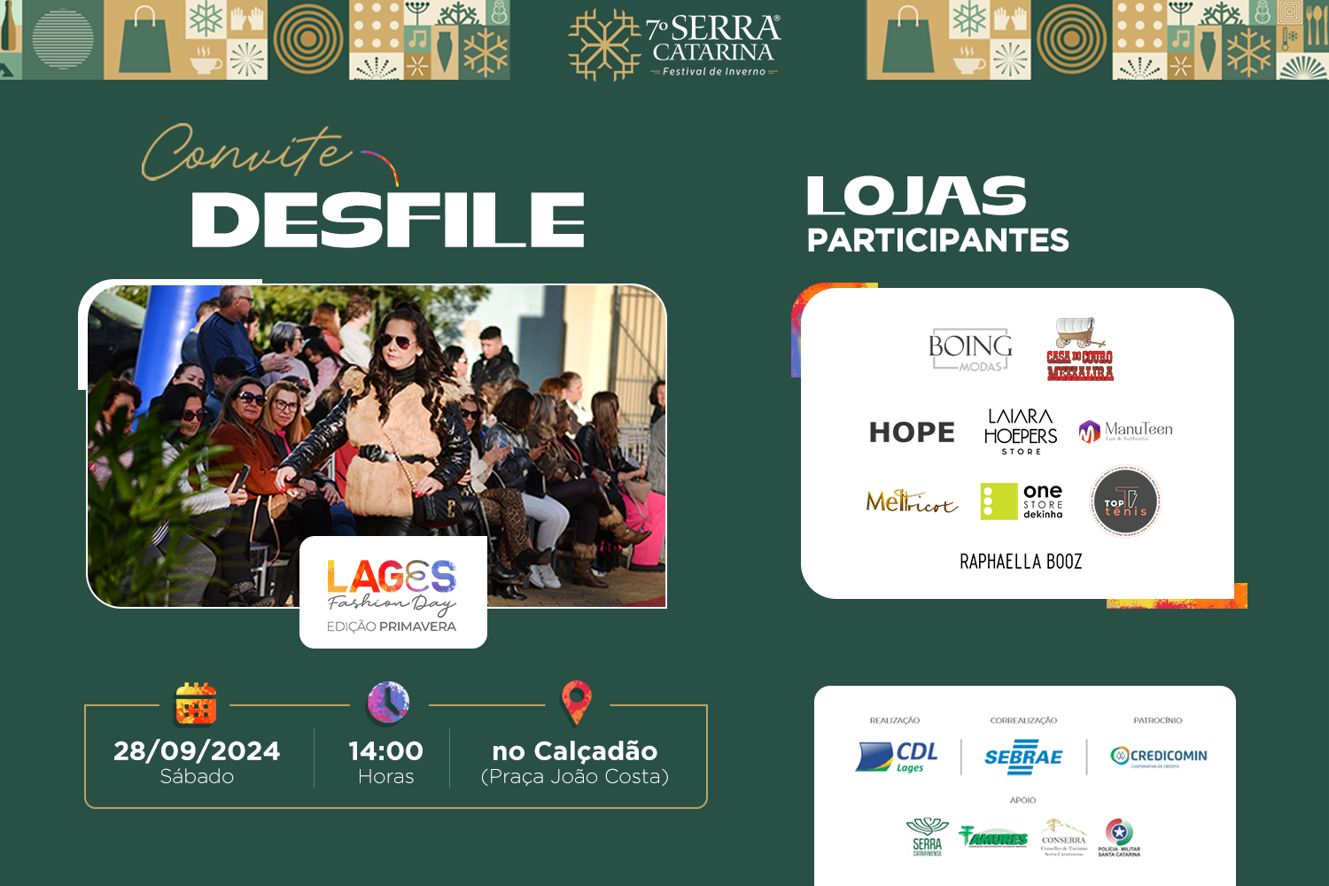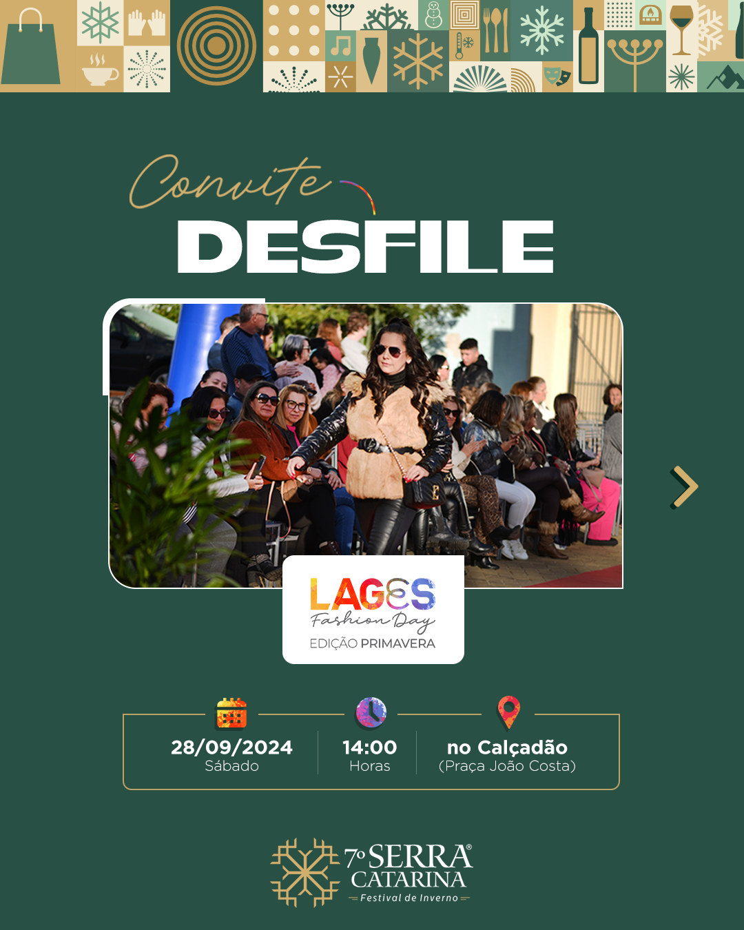 E para fechar com chave de ouro, o encerramento será marcado pela 3ª edição do Lages Fashion Day, que acontecerá no dia 28 de setembro, às 14h, na Praça João Costa, no coração de Lages. Um desfile que promete surpreender e encantar, reunindo moda, cultura, gastronomia e cervejaria. Venha prestigiar, celebrar e dizer que esta temporada foi, de fato, um sucesso.