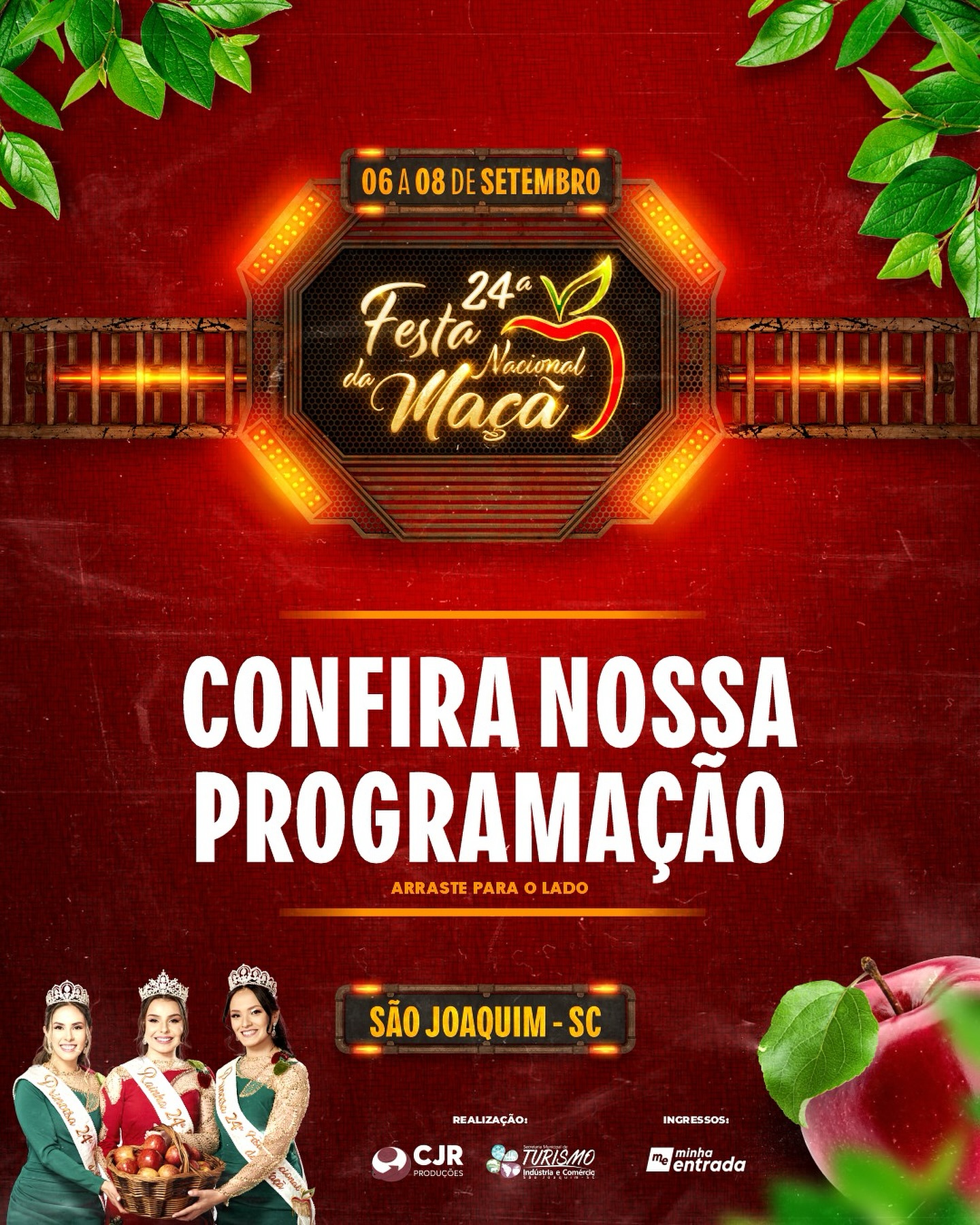 Evento começa na sexta-feira, 6, com entrada gratuita no parque da Maçã e do Vinho, programação cultural diversificada, e ingressos para os shows nacionais disponíveis online no site https://minhaentrada.com.br/evento/24a-festa-da-maca.