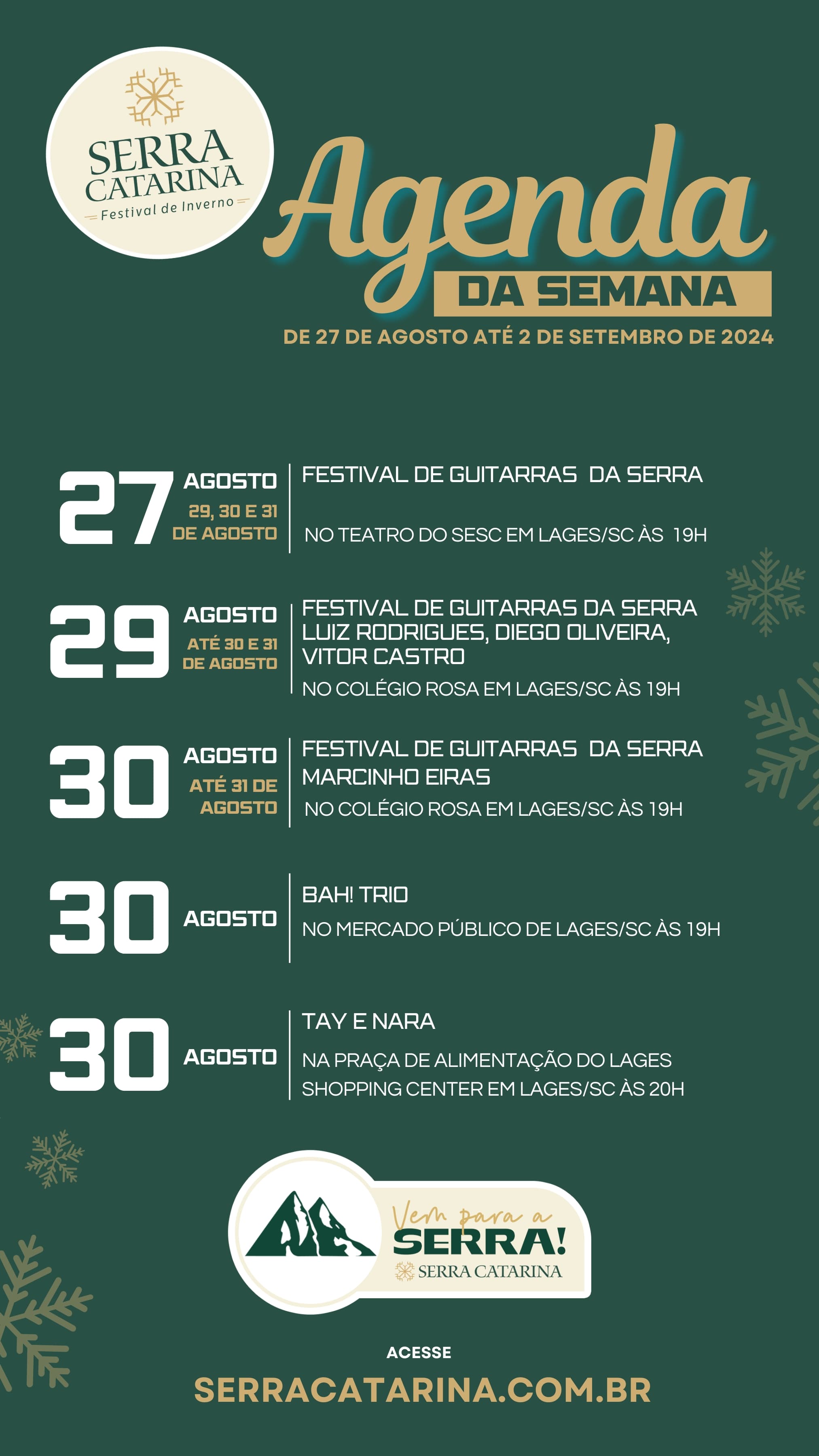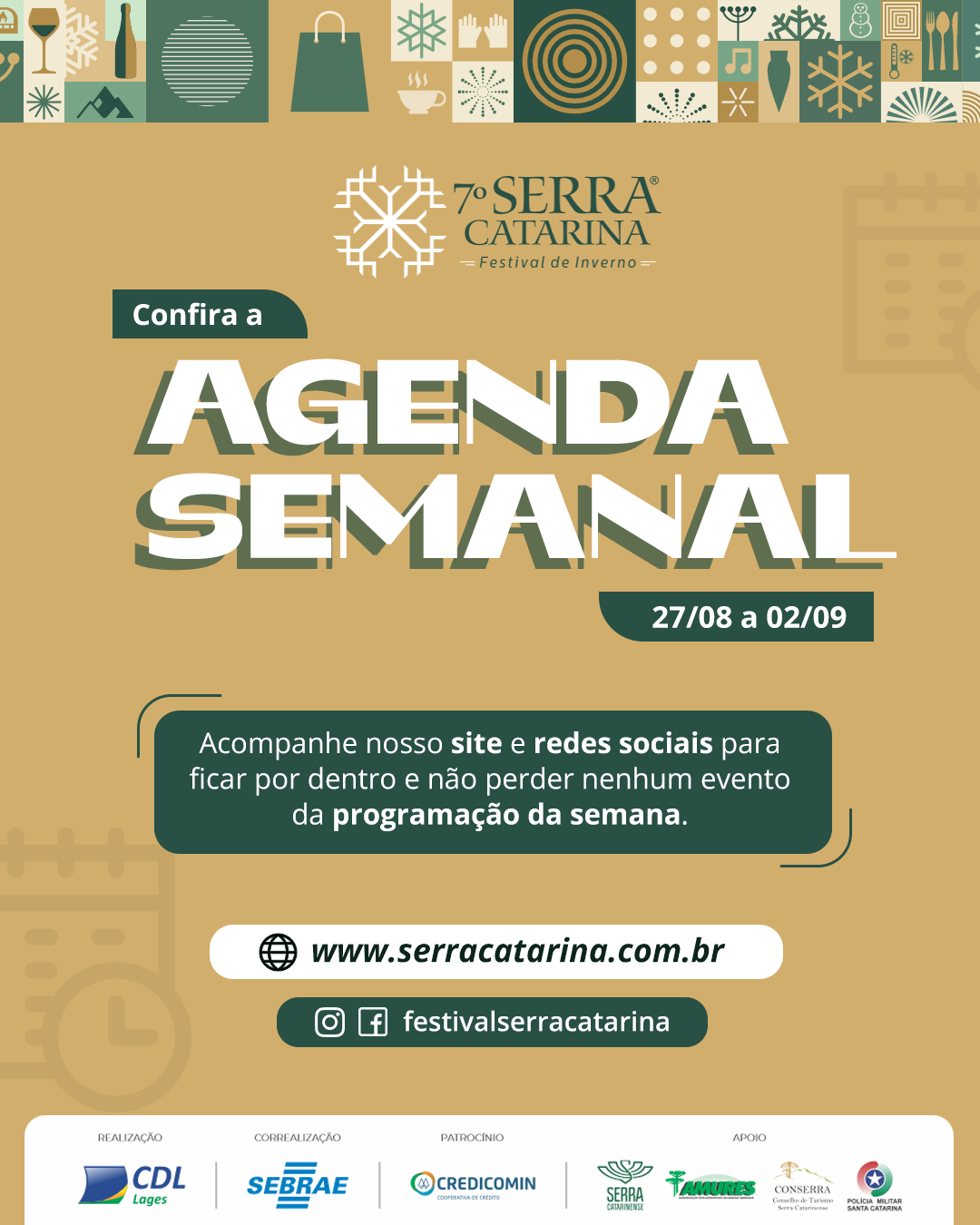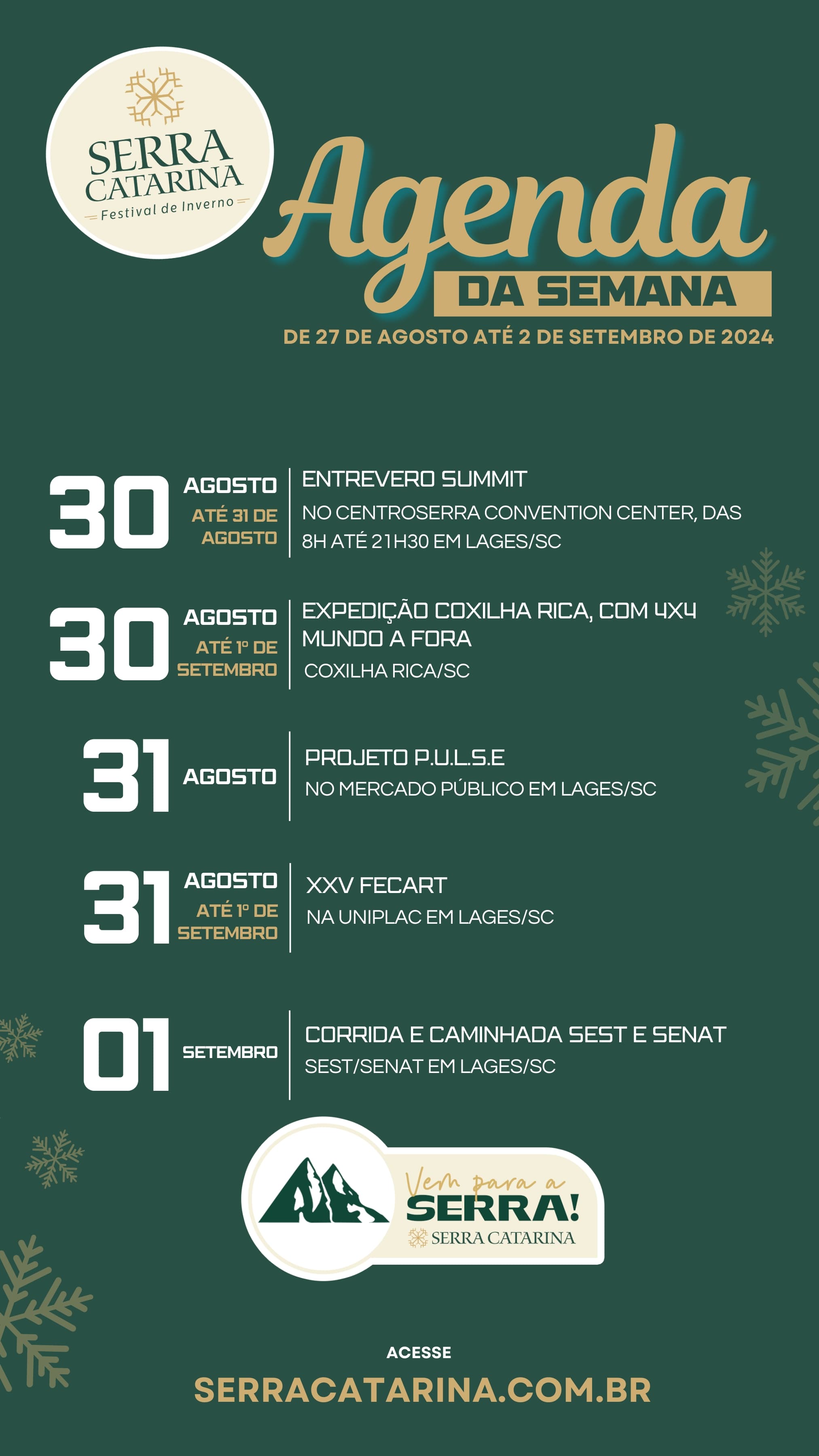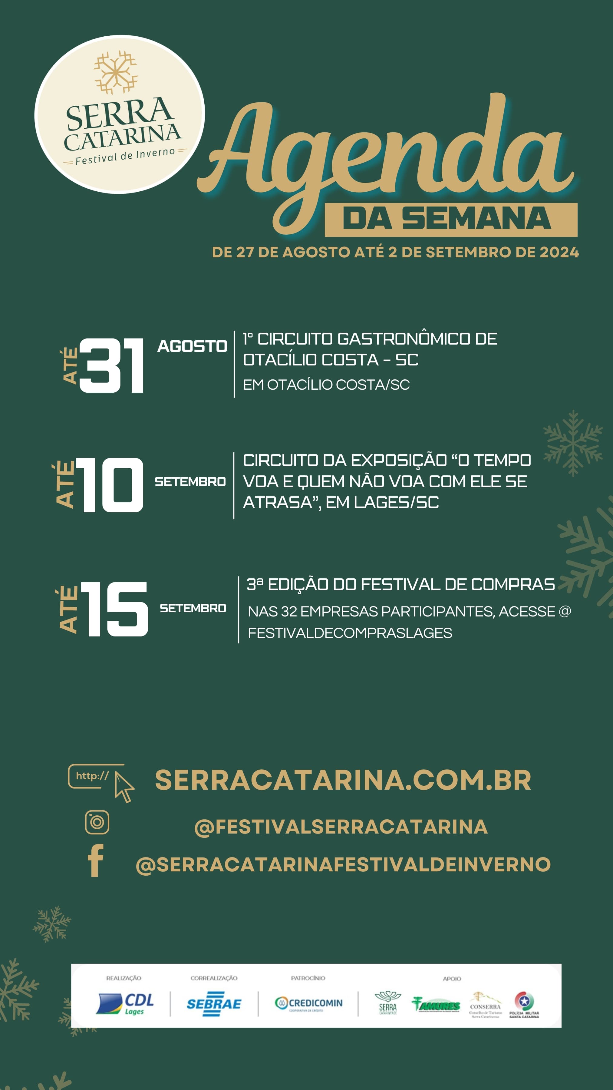 O 7º Serra Catarina Festival de Inverno segue até 21 de setembro, reunindo uma programação intensa e diversificada de toda a Serra Catarinense. O festival é uma celebração da cultura, turismo, gastronomia e eventos que fazem da região um destino imperdível durante os meses mais frios do ano. É um momento em que as cidades se enchem de vida, com atividades que envolvem toda a comunidade e atraem visitantes de diferentes lugares, fortalecendo a economia local. A programação completa pode ser conferida no site https://www.serracatarina.com.br/